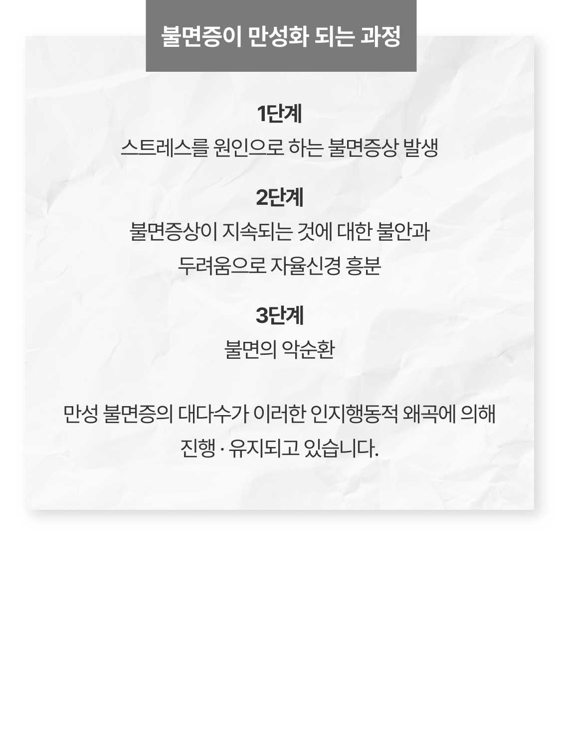 만성 불면증의 대다수가 이러한 인지행동적 왜곡에 의해 진행 · 유지되고 있습니다.