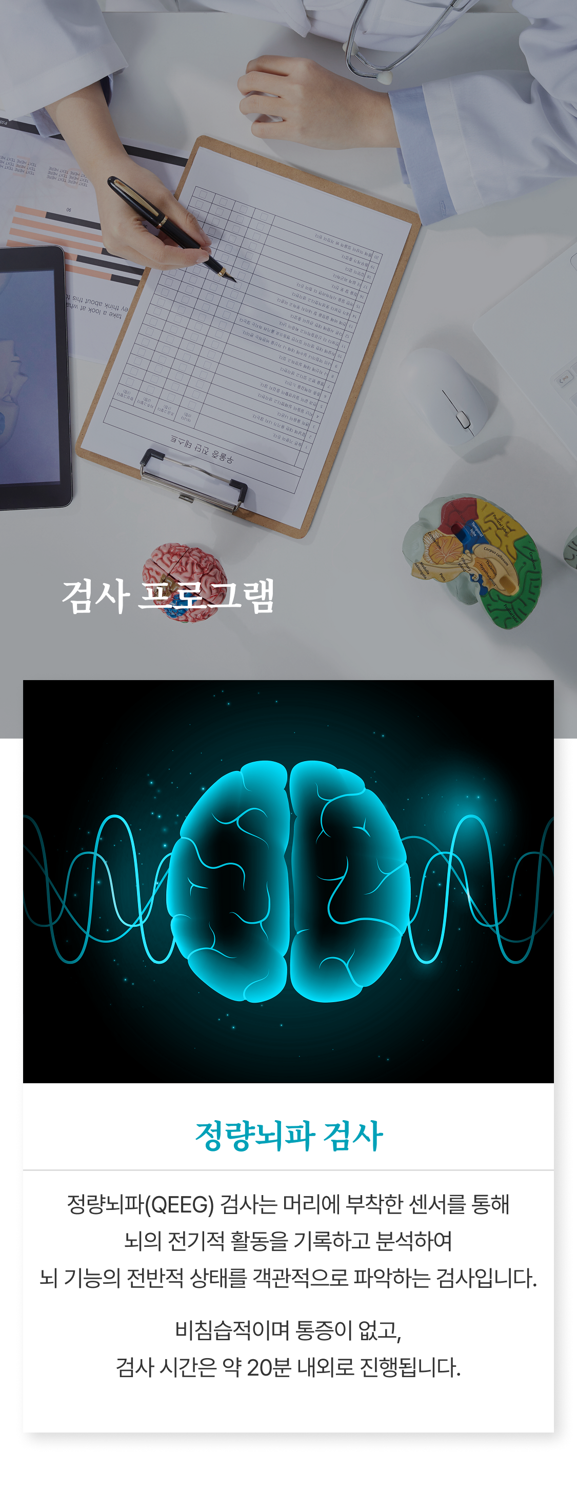 비침습적이며 통증이 없고, 검사 시간은 약 20분 내외로 진행됩니다.