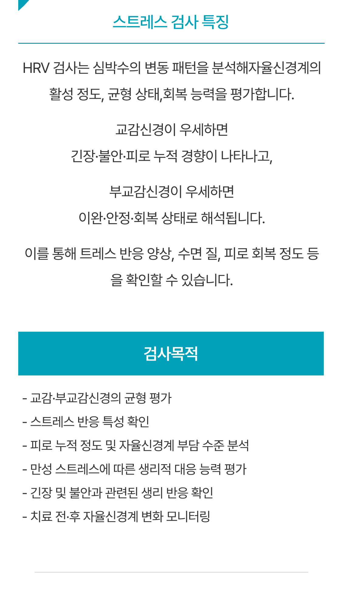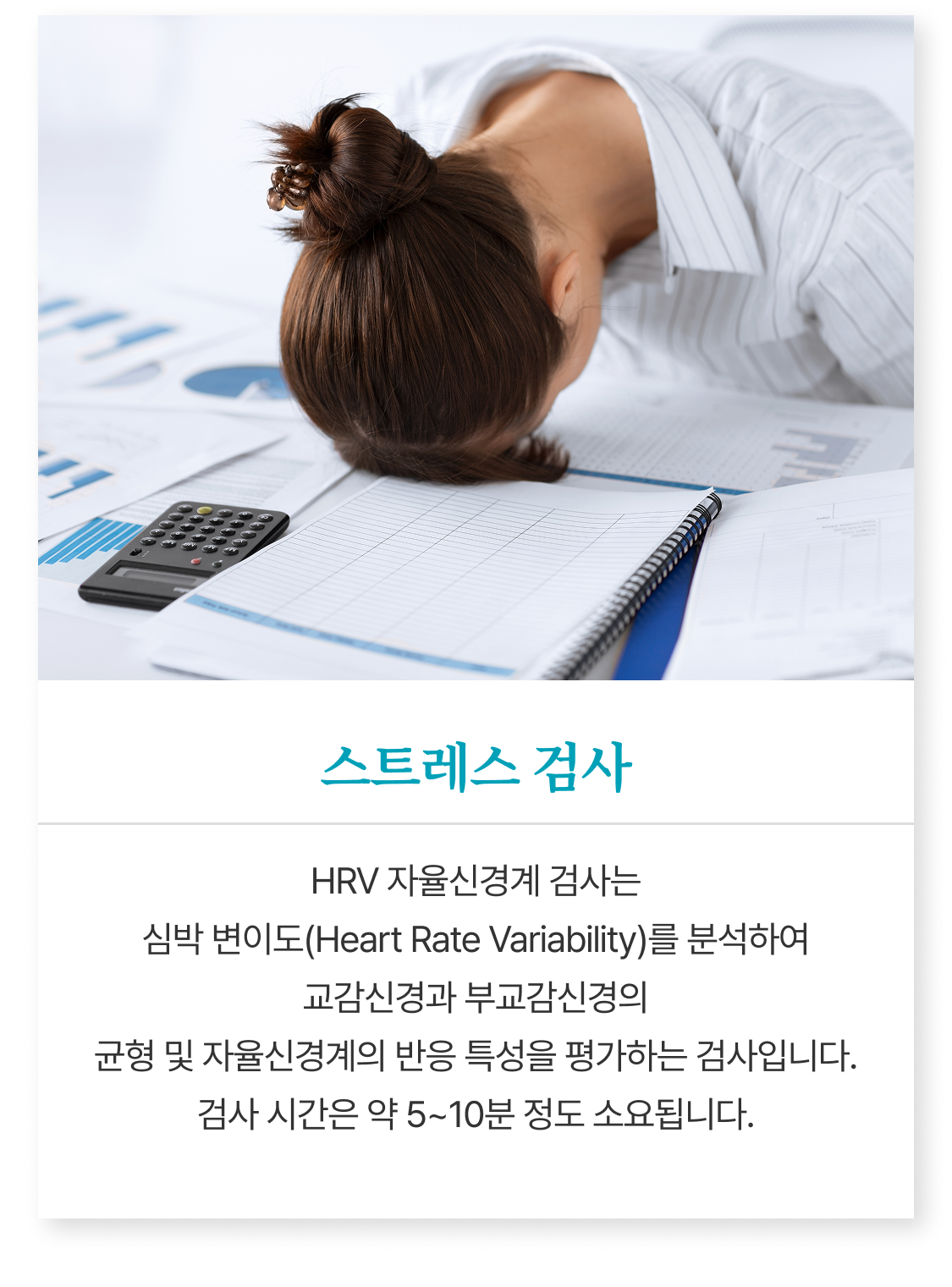 교감신경과 부교감신경의 균형 및 자율신경계의 반응 특성을 평가하는 검사입니다.