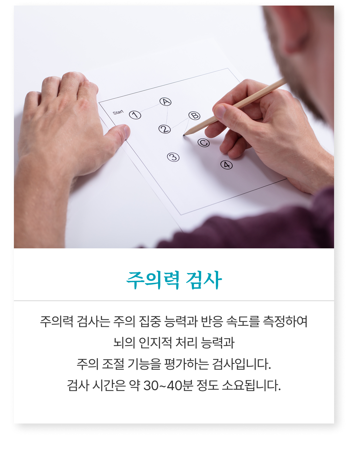 뇌의 인지적 처리 능력과 주의 조절 기능을 평가하는 검사입니다.
