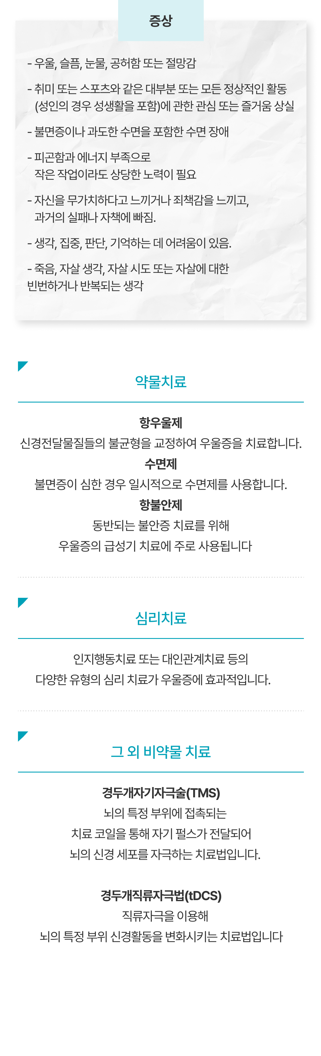 인지행동치료 또는 대인관계치료 등의 다양한 유형의 심리 치료가 우울증에 효과적입니다.