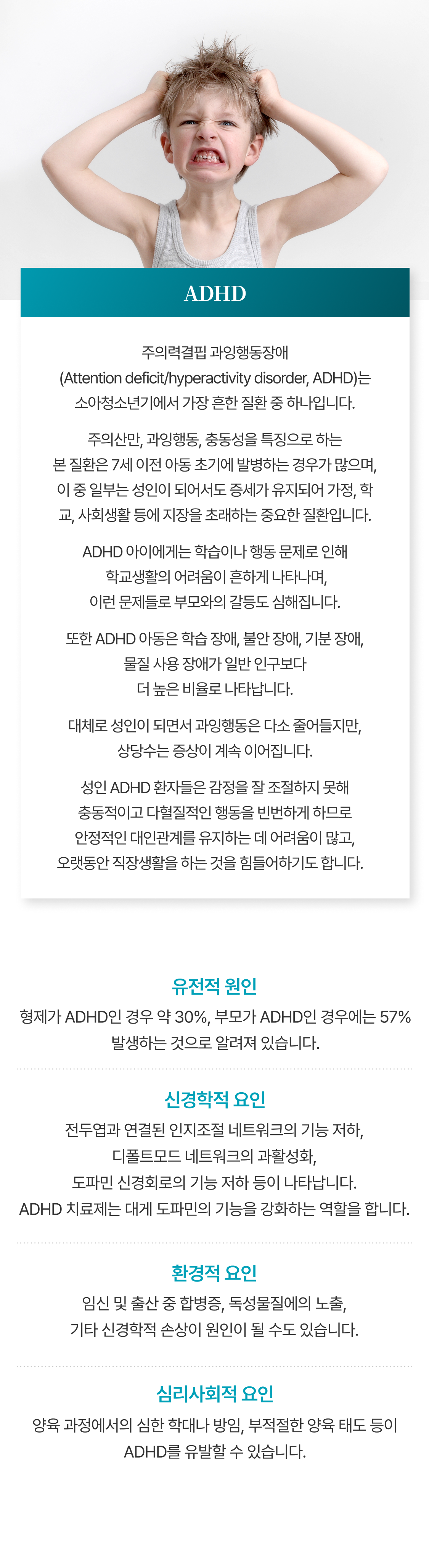 이 중 일부는 성인이 되어서도 증세가 유지되어 가정, 학교, 사회생활 등에 지장을 초래하는 중요한 질환입니다.