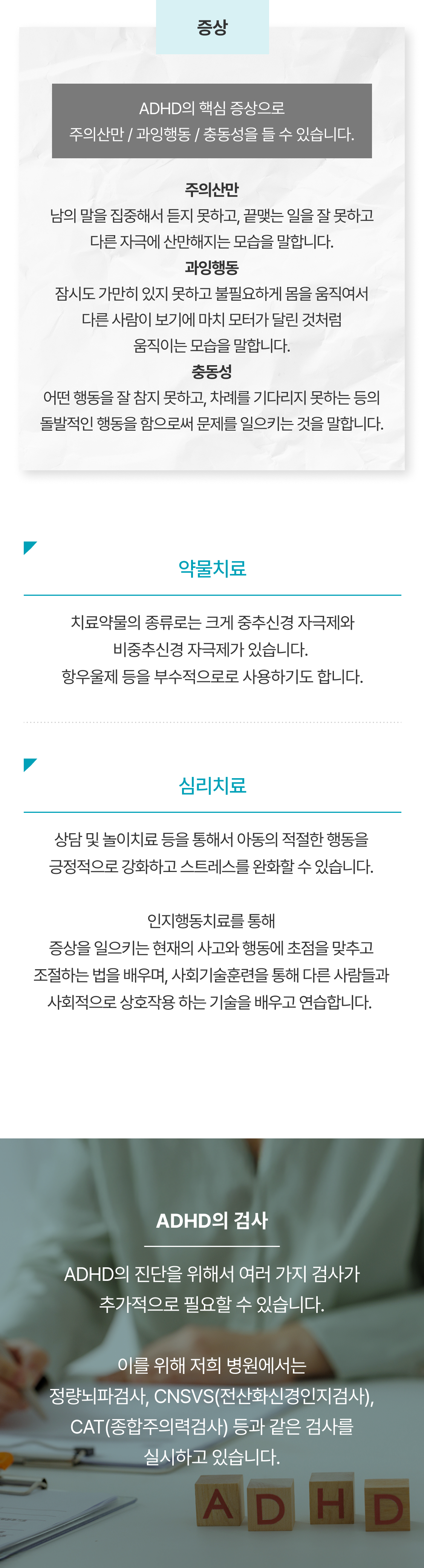 ADHD의 핵심 증상으로 주의산만 / 과잉행동 / 충동성을 들 수 있습니다.
